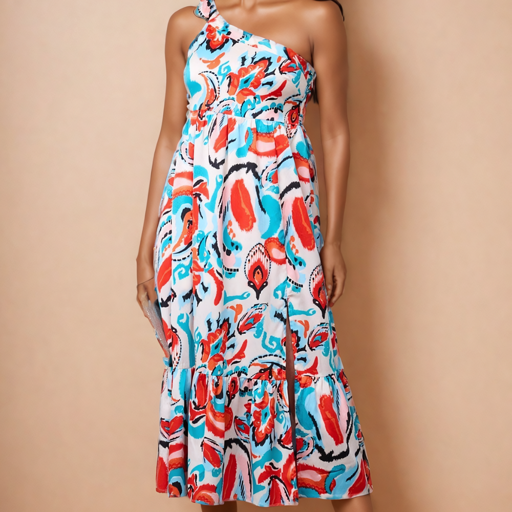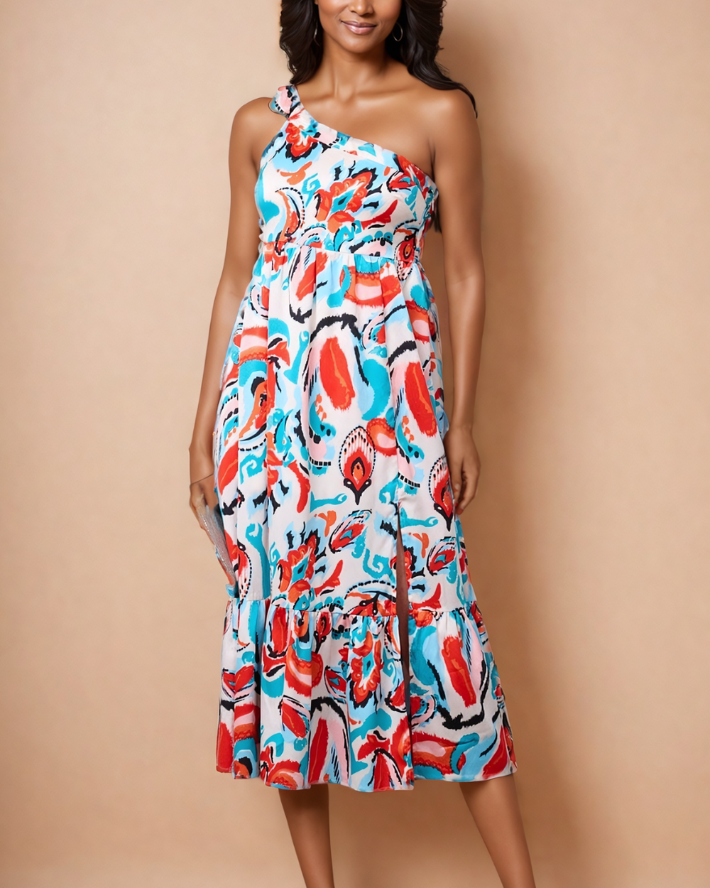 Lila Tie One-Shoulder Tie Midi Dress, a vision of elegance and sophistication. This lightweight satin dress drapes you delicately, enveloping you in softness and comfort. The abstract pattern, adorned with bold red hues, adds a touch of drama and allure, ensuring you stand out as a wedding guest or the center of attention at any special occasion. With its flattering silhouette and eye-catching design, the "Eva" dress is guaranteed to turn heads and leave a lasting impression wherever you go.
