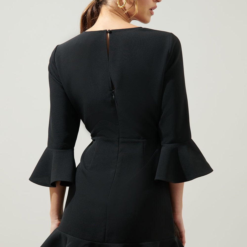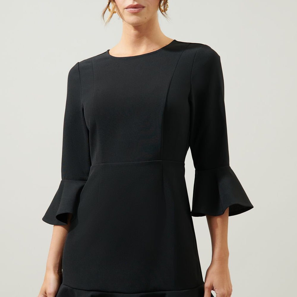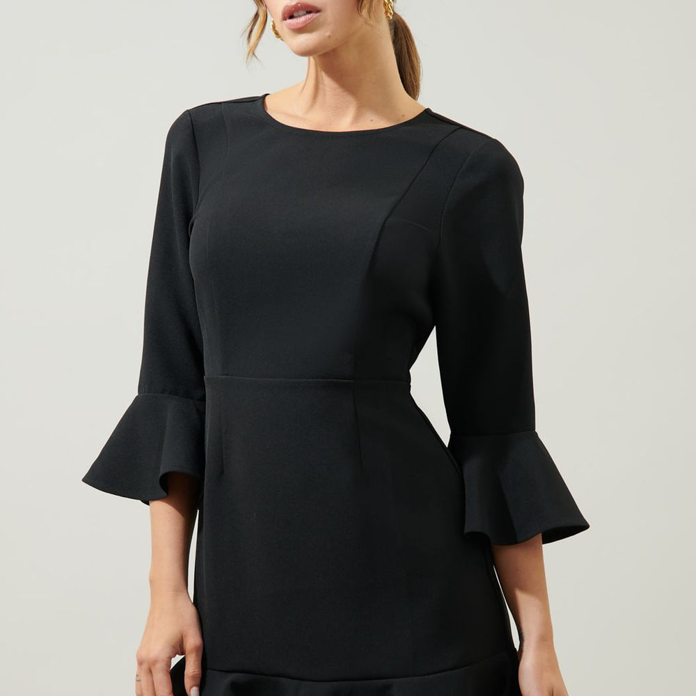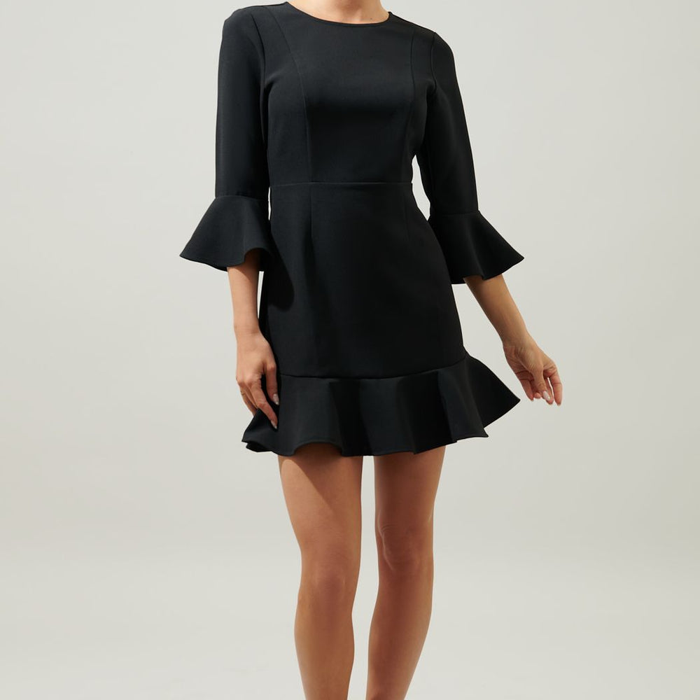 A ruffle classic. Keep things sweet and refined in this heavyweight mini dress. A high quality textured fabric shapes this sheath dress. Features half sleeves with ruffle bell cuffs that frame a sleek bodice. Princess seams start from shoulder to hips to create a flattering figure. The dress finishes off with a ruffle hem.
