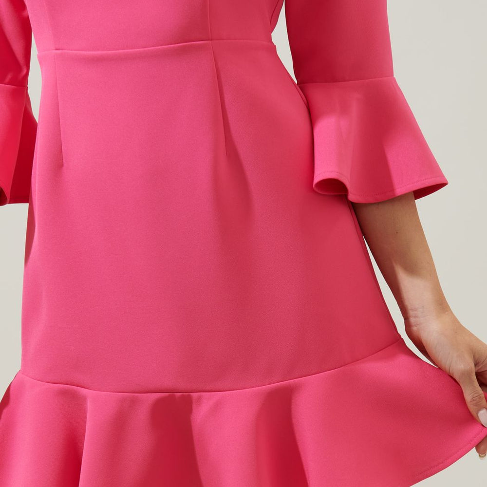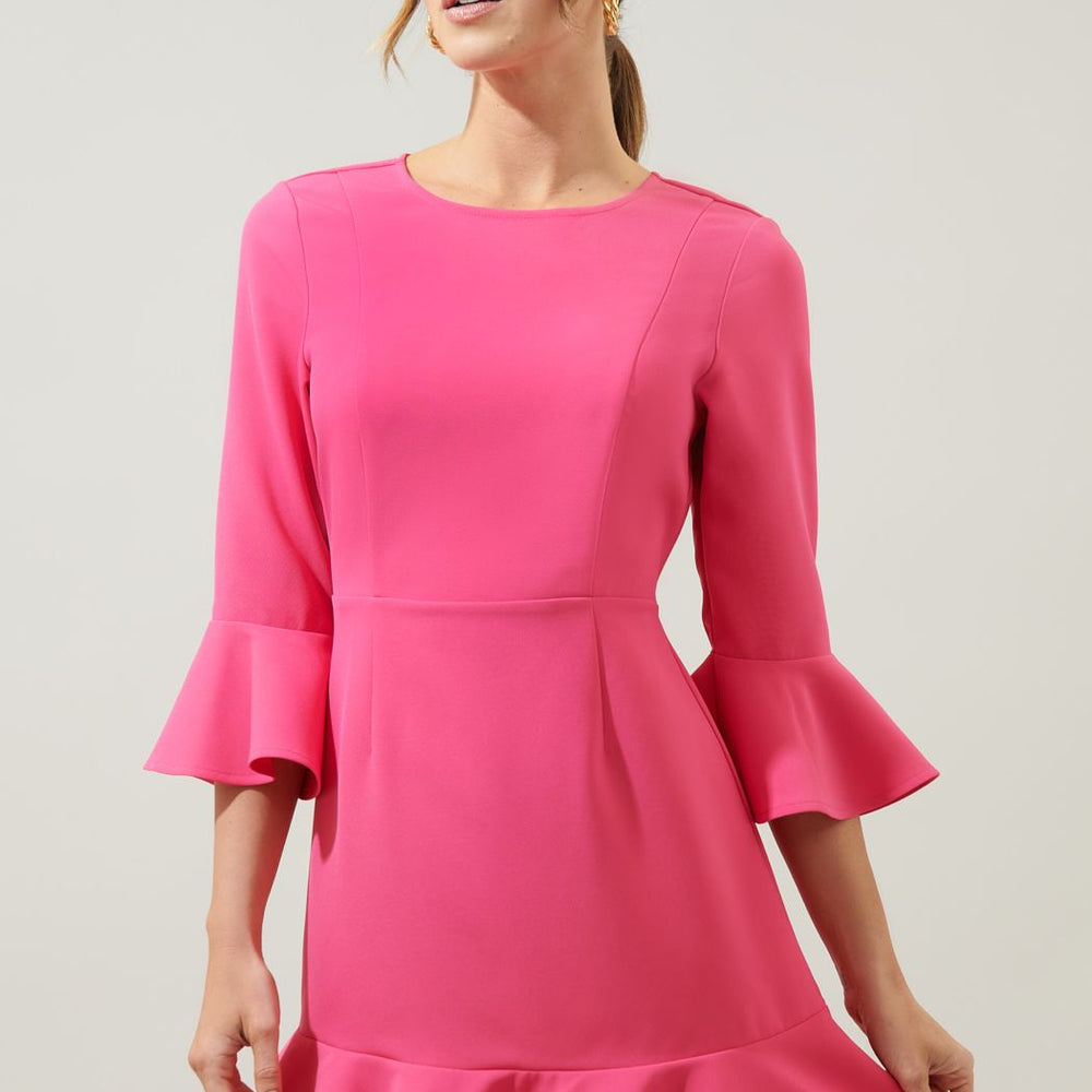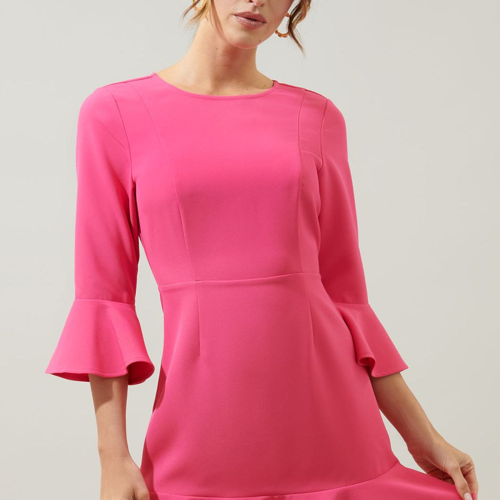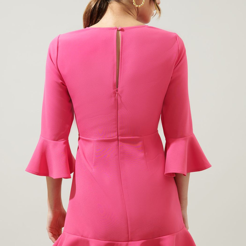 A ruffle classic. Keep things sweet and refined in this heavyweight mini dress. A high quality textured fabric shapes this sheath dress. Features half sleeves with ruffle bell cuffs that frame a sleek bodice. Princess seams start from shoulder to hips to create a flattering figure. The dress finishes off with a ruffle hem.