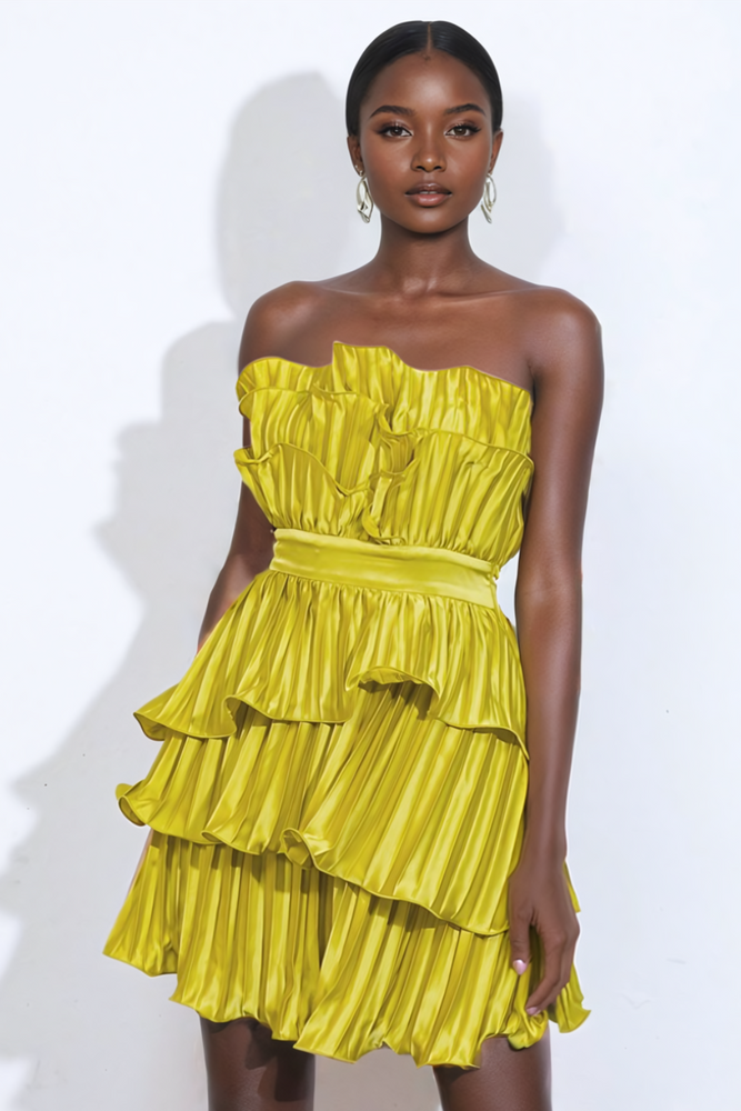 Experience the elegance of the Olivia Tiered Mini Dress, a stunning woven piece featuring a strapless neckline and beautifully pleated bodice. A convenient side zipper adds effortless sophistication to this exclusive design.