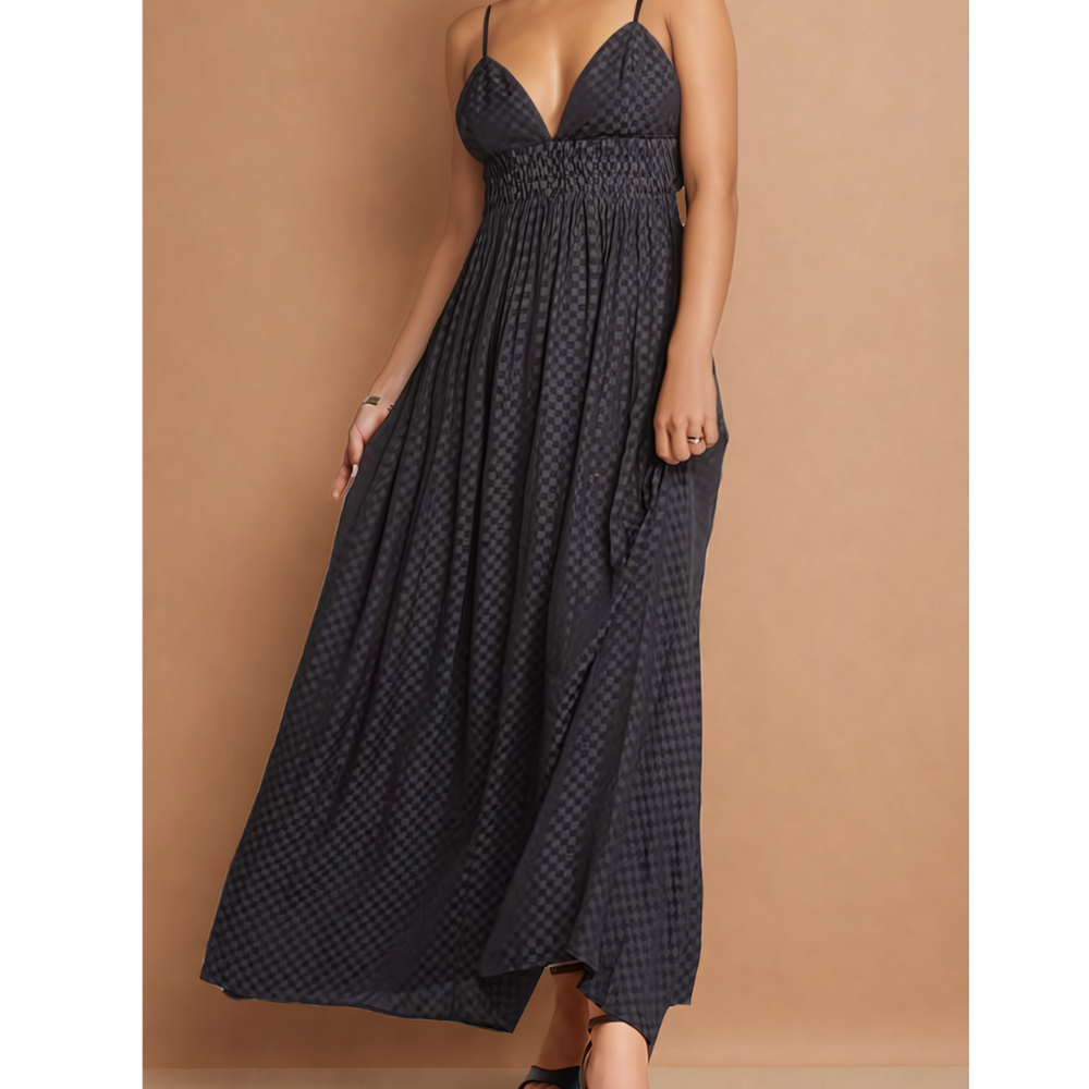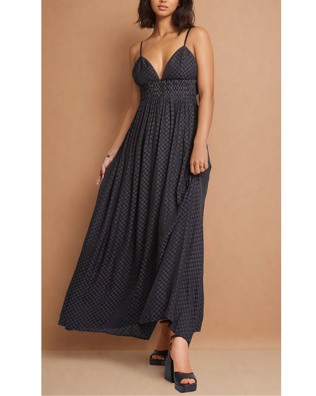 The Tiffani Midnight Checkered Maxi Dress is the perfect maxi choice, featuring a charming peekaboo back. The black checkered pattern adds a touch of flair