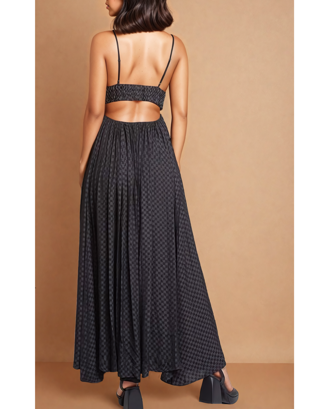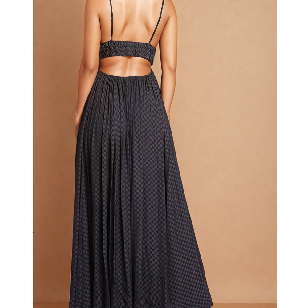 Regular price $59.00The Tiffani Midnight Checkered Maxi Dress is the perfect maxi choice, featuring a charming peekaboo back. The black checkered pattern adds a touch of flair