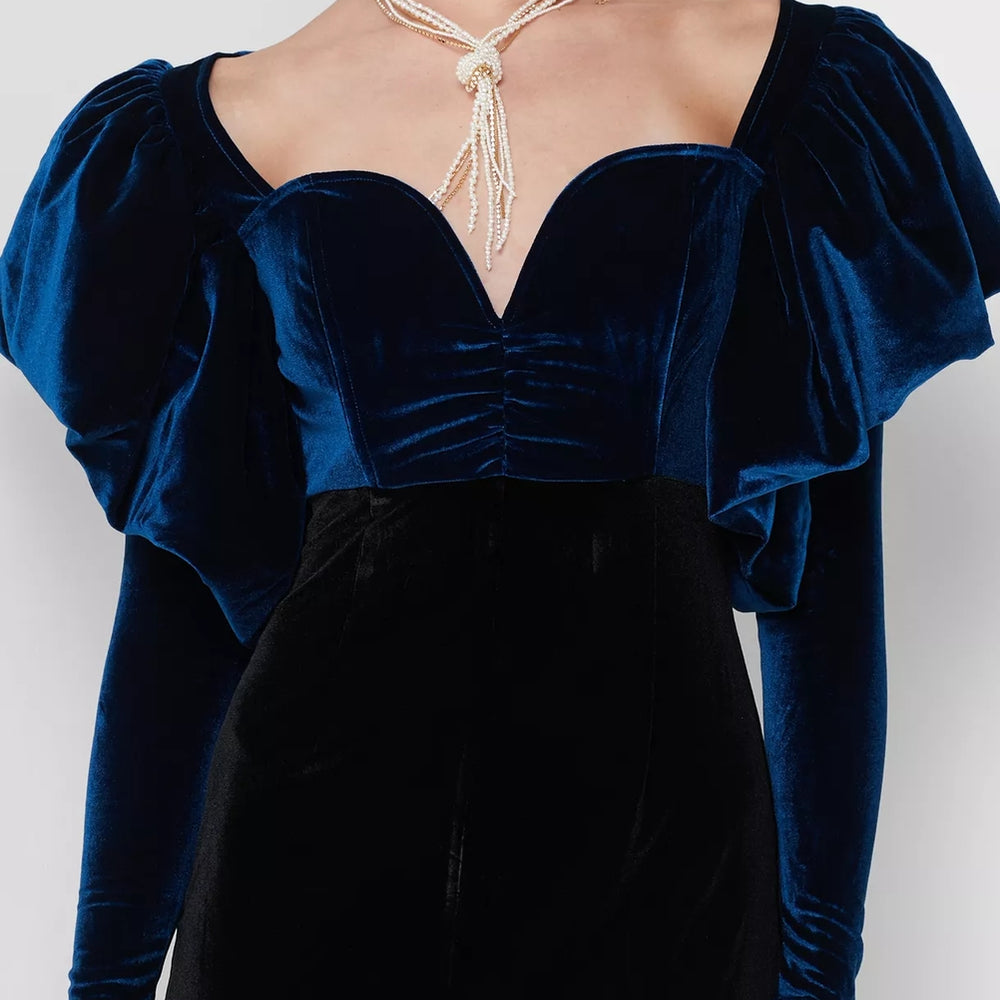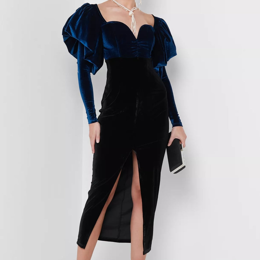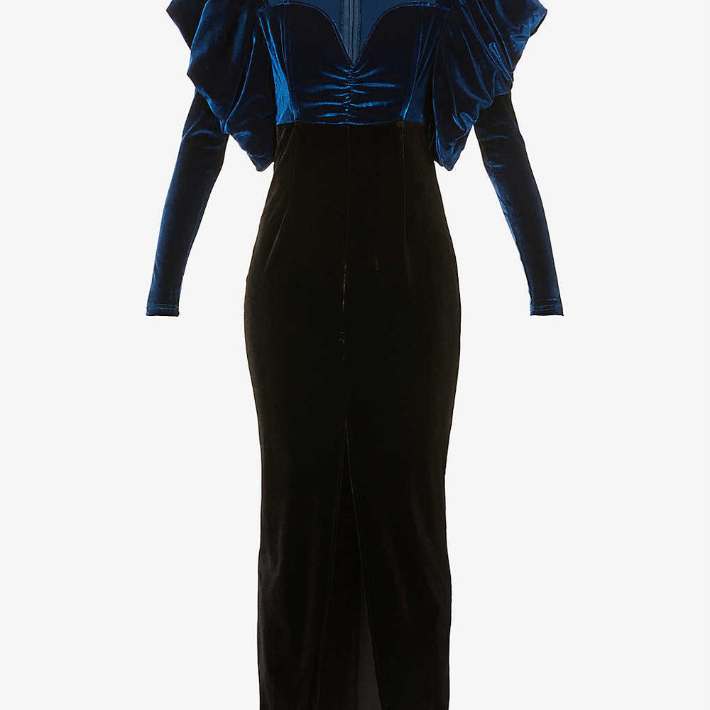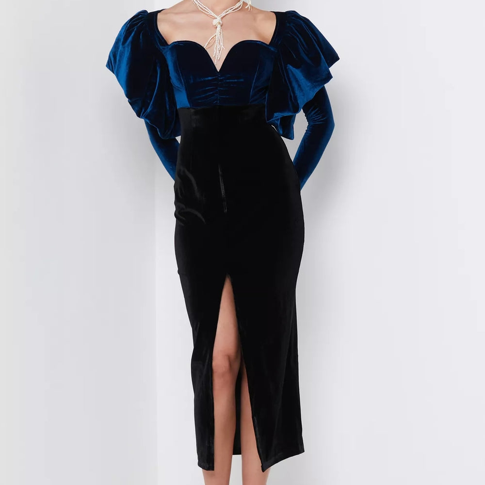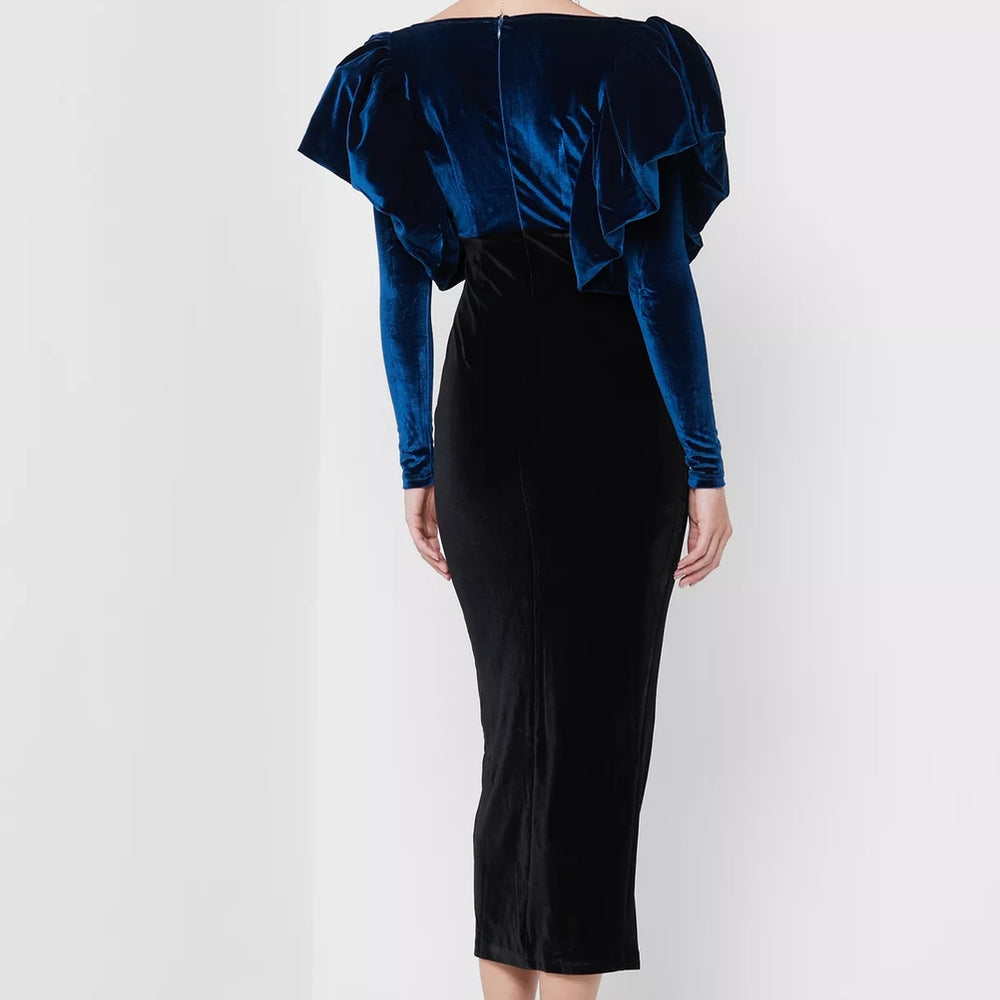 A luxurious velvet style stretch fabric midi dress with a sweetheart neckline and shoulder frill detail. A high front slit adds detail to the fitted skirt.