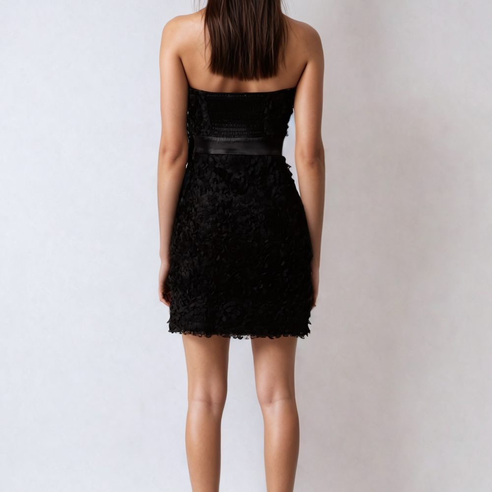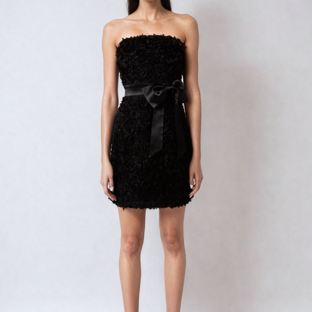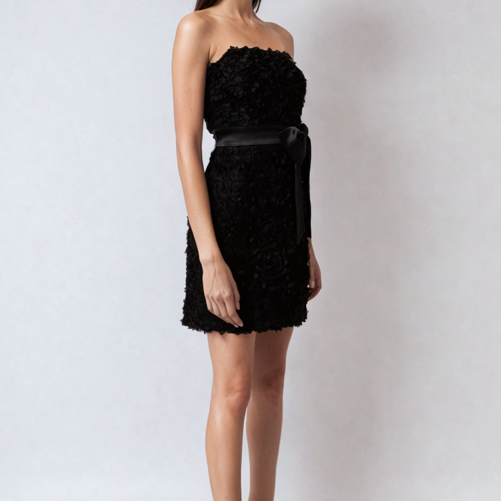 Alessi Bow Detail Fitted Bandeau Dress—fitted bandeau dress with textured fabric. Bow detail on the waist. Rear zip enclosure.