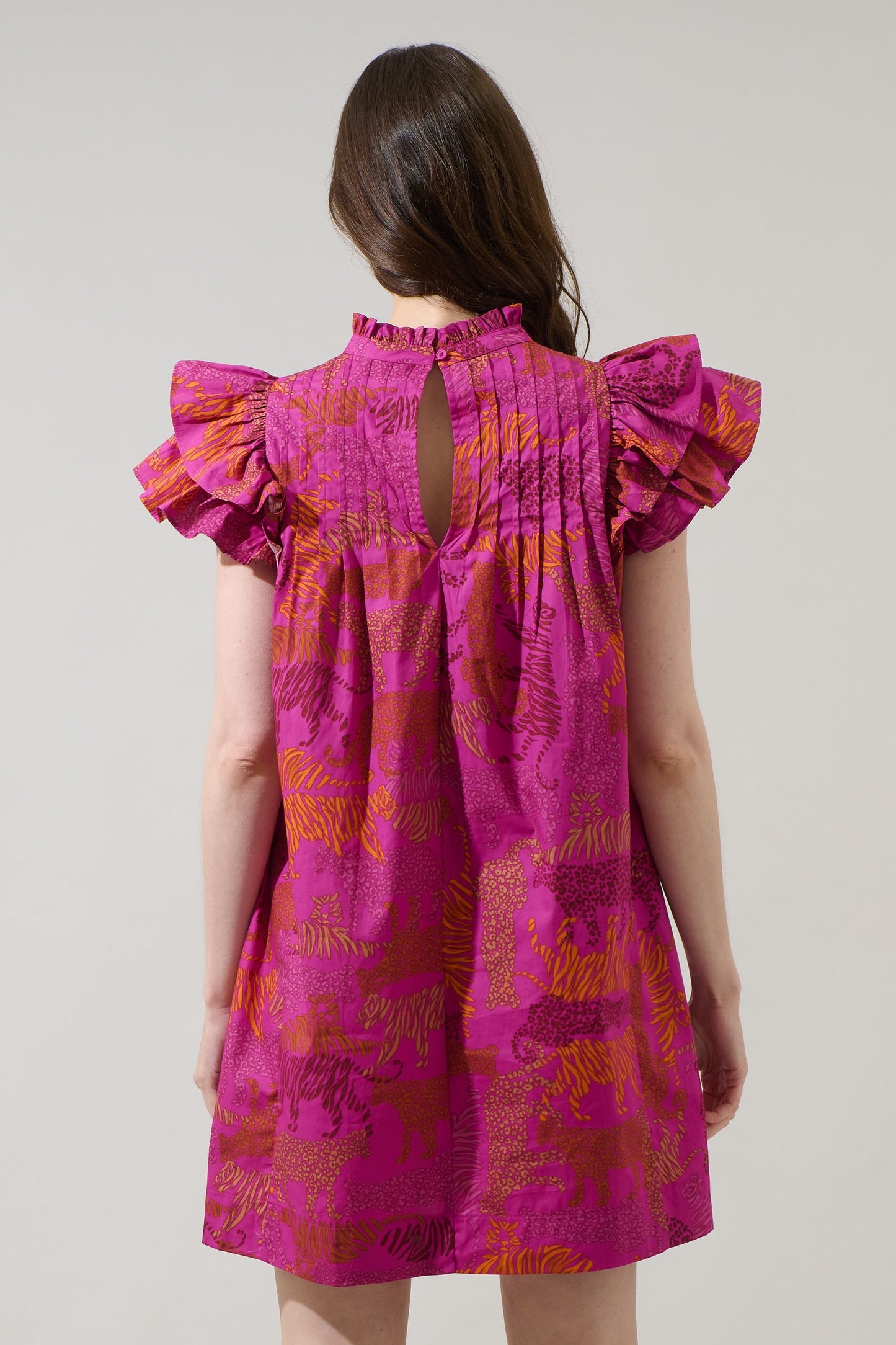 Regular price $95.00Bring the jungle vibe in this fierce tiger and cheetah print dress. Short layered ruffle cap sleeves frame this mock neck, pleated front mini dress. The back also had pleats on the top and a keyhole. Style it with black ankle boots and gold hoops for an effortlessly bold look.