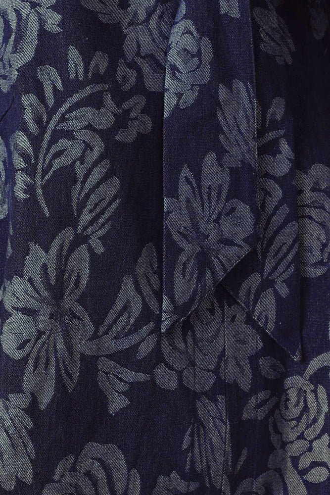 A jacquard denim mini dress featuring front bow tie closure and long sleeve